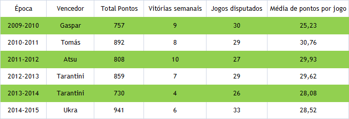 2010-2011: Tomás se não pontuasse na última jornada venceria na mesma. vitória à 29ª jornada (ganhou com 41 pontos de vantagem; Bruno Gama não jogou na jornada 29 e Tomás aumentou aí a vantagem pra 40 pontos; na última jornada Gama só somou 31);