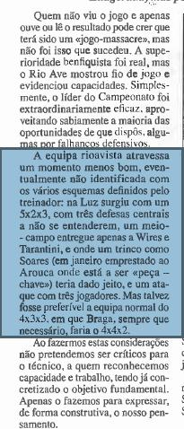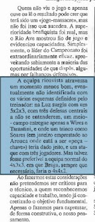 - Soares pode vir a ser revelação; não tem medo de vir buscar a bola e joga raramente para trás; gosta de colocar a bola na frente, nos extremos, embora (neste jogo) nem sempre bem;