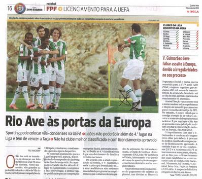«"Não faz muito sentido ficarmos em 14º lugar e participarmos na Liga Europa, mas teremos de aguardar pela final da Taça e só depois tomar uma posição", afirmou António da Silva Campos, presidente do Rio Ave, que preferia conquistar "dentro de campo" o direito a jogar uma competição europeia pela primeira vez na história do clube»..