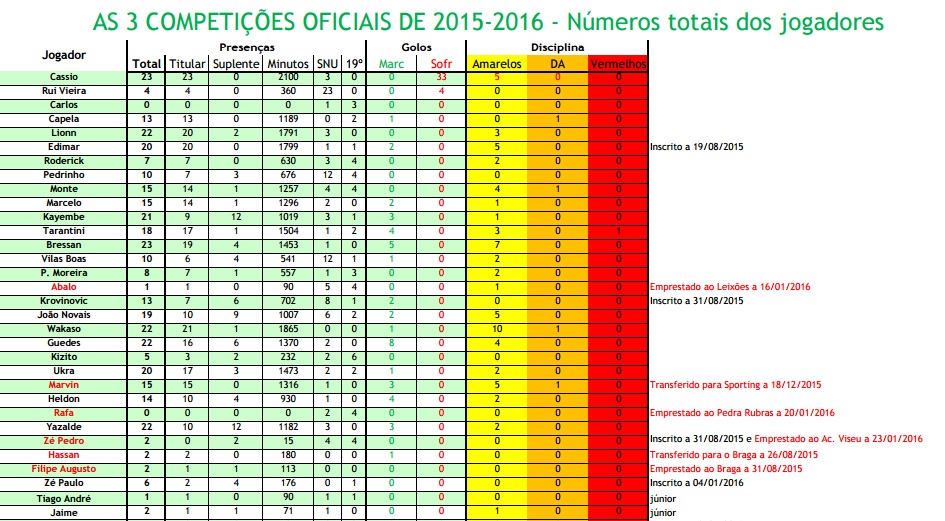 Como nota prévia, há que dizer que alguns destes números podem não corresponder à realidade. Passo a explicar: o Rio Ave em vários jogos desta Liga optou por não divulgar lista de convocados. Assim, nesses encontros contámos os 18 da ficha de jogo como os únicos convocados. Em casos de lesões prolongadas e conhecidas, a ausência foi dessa forma contabilizada, mas nos restantes jogadores todos entraram no rol dos não convocados. Os números são como os vemos abaixo.